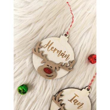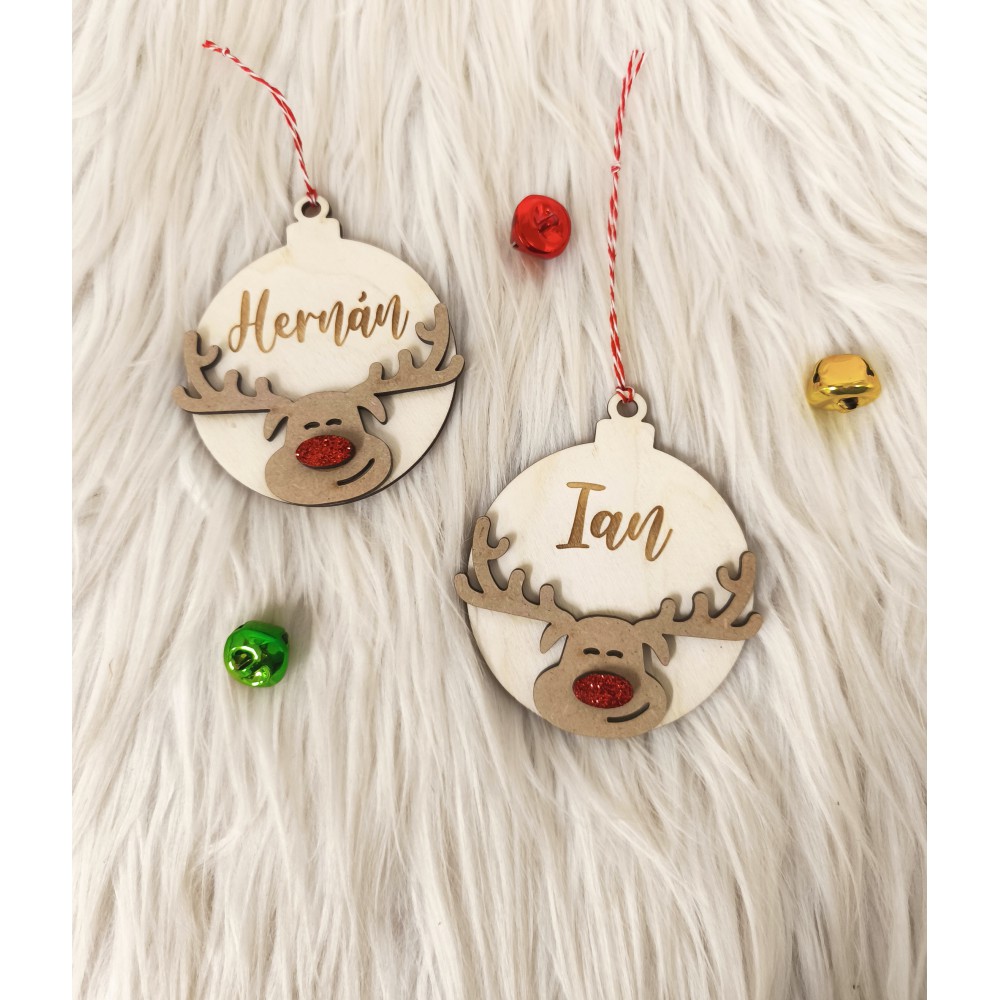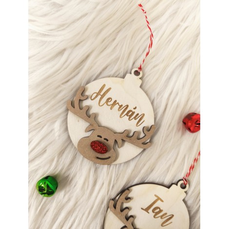 Bolas de madera a doble capa con reno y nariz de brillantina, personalizada con el nombre.