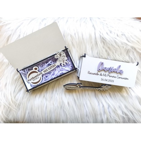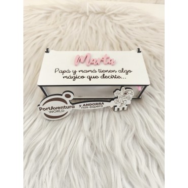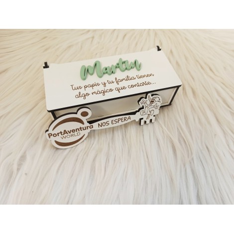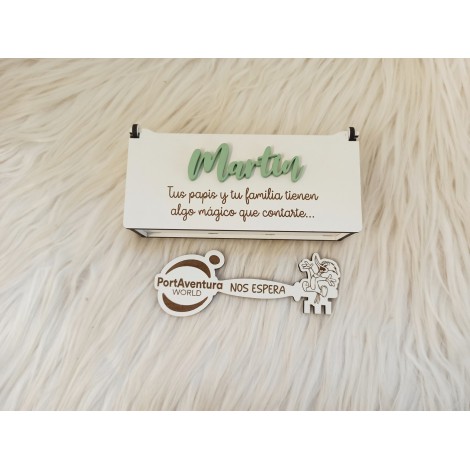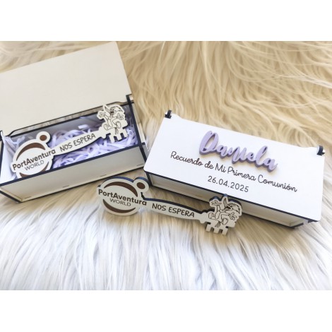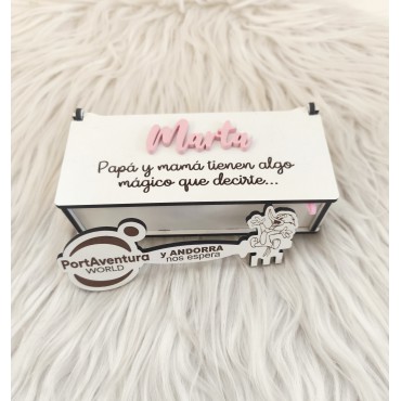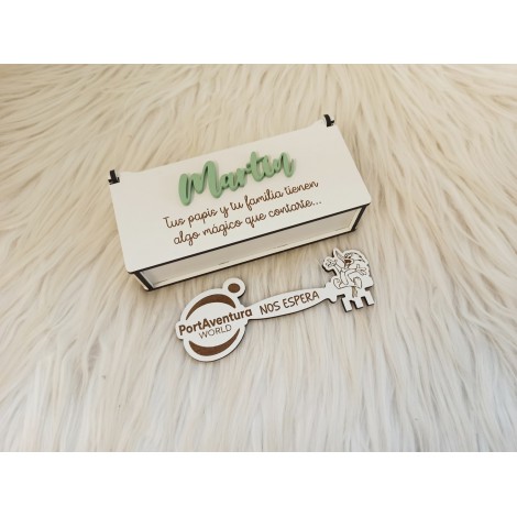 Sórprende a esa persona especial dándole la noticia de que os vais a PortAventura con nuestra llave en cajita personalizada.