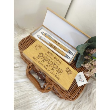 Pack en caja de bolígrafo y portaminas de bambú a personalizar con nombre y diseño elegido. Ideal para tener un detalle de agradecimiento con el profe o seño de tu peque al finalizar el curso escolar.